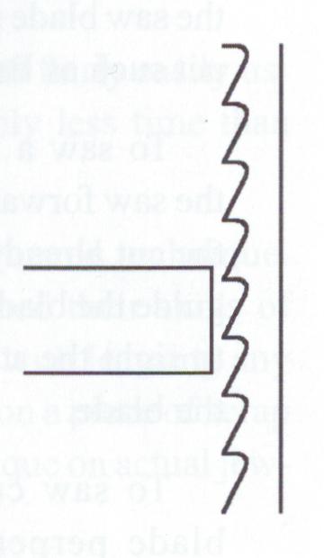 To begin cutting, place the metal on the bench pin. Hold it firmly; if the metal slips the blade will break. Rest the saw blade against the metal's edge and gently draw the blade downward. The blade should begin to cut. If it does not, check the blade. It maybe the wrong size for the metal being cut or it maybe installed upside down. The teeth should point down towards the handle, cutting on the down stroke. If the teeth point upwards, remove the blade and turn it around.