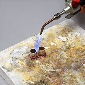 Solder the tubing to a base plate. Place a 25.5 x 13mm (1 x 1/2-in.) piece of flat 24-gauge (0.5mm) sterling silver sheet on a soldering pad. Place the two pieces of tubing on end on the base plate so the pieces do not touch.
