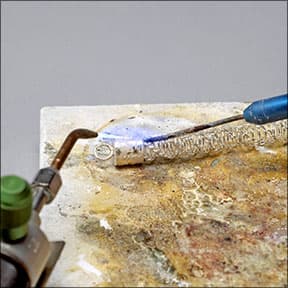 Working with one end cap at a time, melt a pallion of easy solder, and bring it to an end cap on a soldering pick. Using a soft, bushy flame, focus the heat on the end cap.
