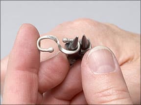 Attach a jump ring to each end cap. Either make or purchase two 18-gauge (1.0mm), 5mm ID sterling silver jump rings. Place an end cap on a soldering pad with the closed end facing up, and flux it. Close the jump ring, and use cross-locking tweezers to hold the jump ring opposite its seam. Flux the jump ring, and sweat a small pallion of medium solder onto the seam.