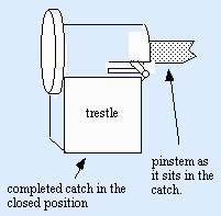 2) The top of the upright is grooved with a chenier file or a separating followed by a round nosed needle file. The outer tube fits into the groove. outside tube is cut somewhat larger than the width of the trestle. As it is cut 'longer than' no actual measurement is made which saves time. Any time a part can be cut 'longer than' without a measuring step the procedure is made more efficient. This is an example of relative fitting. The outer tube is soldered in place with a minimum amount of solder. Preferably one uses small solder balls placed in an area where no residue or 'scar' from overheating can be left. Hard solder is recommended for every joint in the construction of the catch except for the final soldering to the pin.