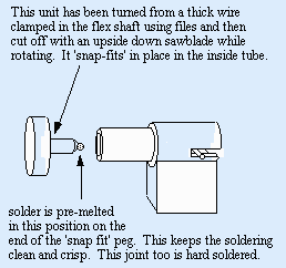 6) At this point one decides what the button or knob looks like with which one draws back the inner tube to allow the pinstem into the slot. One can use a piece of metal balled up on a charcoal block soldered to the inner tube or a slice off a thick wire (think of slicing salami) or even thick jump ring soldered around the very end of the inner tube. personal preference is one shared by many model makers; that one turn a knob along with a 'snap fit' peg from a single piece of thick wire. 'snap fit' peg clicks into place inside the inner tube for accurate fitting easy soldering. The solder is pre-melted on the end of the peg and is drawn to the outside by the heat of the flame in soldering.