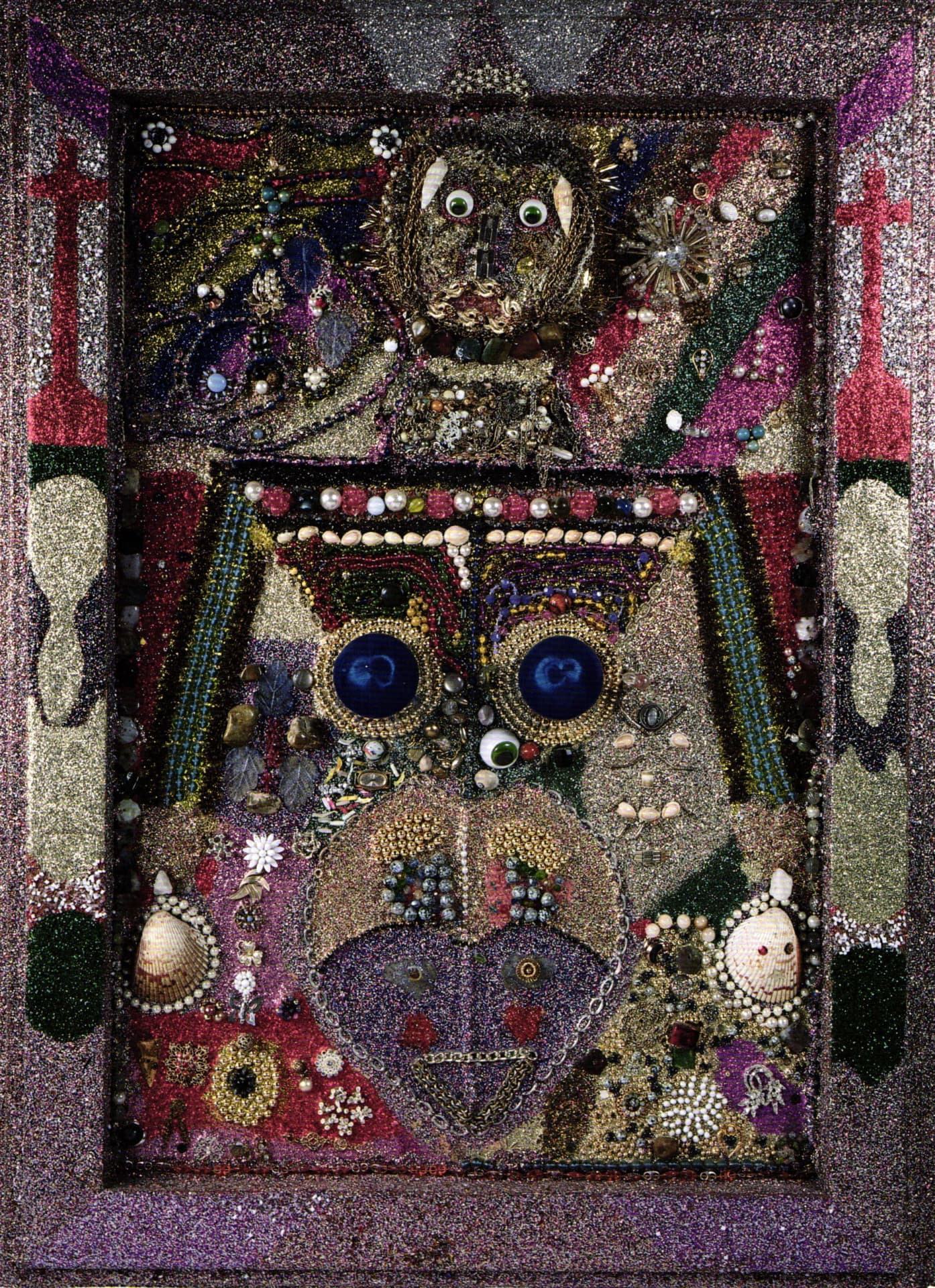 Simon Sparrow and Larry Fuente create works that show a preoccupation with the obsession and accumulation of the detritus of popular culture. Beads and other modular objects like buttons, watches, medals, yo-yos, Scrabble tiles and nail-polish bottles replete with nail polish are heaped into dense and, at first glance, casual agglomerations. These creations, less ironic and cynical than the works created by the East Village artists represented in Structure and Surface, seem to be direct expressions of an artistic vision that celebrates the glitz and surface of contemporary artifacts. Sparrow and Fuente use these ubiquitous and readily available objects out of their curiosity and affection for popular yet eccentric materials.