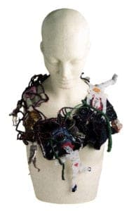 Joyce Scott's neckpieces incorporate an array of beaded figures whose caricature quality makes it easy to overlook content. For example, Dressing for Him portrays the stereotypic role of the seductive, Venuslike sex object in which women sometimes fine themselves caught.