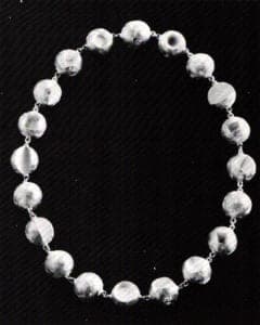 Suzanne Rezac's interest in surface and form is demonstrated by her imaginative and skillful treatment of precious metals like gold and silver. Her sculptural vocabulary in metals consists of geometric forms - circles, spheres, lozenges or squares - and the properties that the metals possess - purity, surface, grain, lustre, weight, smoothness and temperature. Rezac may manipulate the purity of gold in a bead in the same way a painter would use the intensity or value of color to delineate shape and form. This concept can be enhanced by using the warmth of gold in contrast with the coolness of silver or other metals. Ironically, by keying on the simple, intrinsic properties of her materials, Rezac finds infinite creative possibilities.