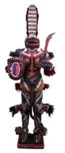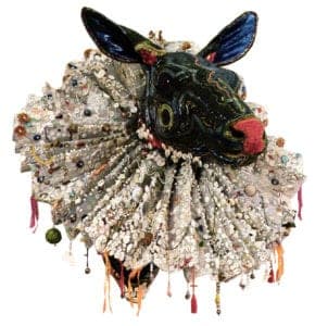 Among the innovative works included in Structure and Surface are the diminutive ritual fetish figures of Mimi Holmes and the opulent and tactile vessel forms of John Garrett. Joyce Scott sews brightly colored beads, newspaper clippings and photographs together to create bold, colorful neckpieces that explore contemporary street life, black music and feminist issues. Larry Fuente restores derelict cars and creates ornate decorative patterns on their surfaces by covering them with a spectacular range of beads, bangles, plastic flowers and found objects. Sherry Markovitz creates life-sized animals such as elk and deer out of papier mâché and covers them with a heavily encrusted surface of intensely colored beads, buttons, fabric scraps and shells. Arch Connelly creates dazzling sculptures by using faux pearls and jewels to cover forms such as an airplane, the prow of a boat, even leaf shapes. This range of works demonstrates that beads are indeed a potent and versatile material.