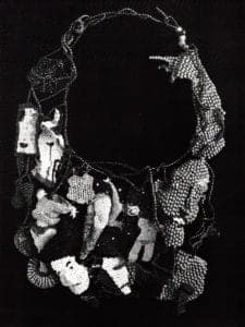In Night in the City Joyce Scott evokes the tension of urban life by collaging the photograph of a dark alley into the neckpiece. The artist also explores the issue of rape. Multiple unclothed figures are imprisoned in a tangle of webbing, and a white female torso is covered with yellow hand prints, symbolic of violation. The irony of Scott's art is that it is beautiful, thereby fulfilling its function as adornment, yet its content undermines our expectation for the object to perform a singular task - decoration.