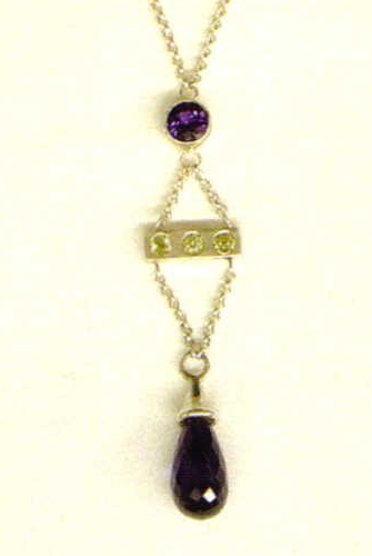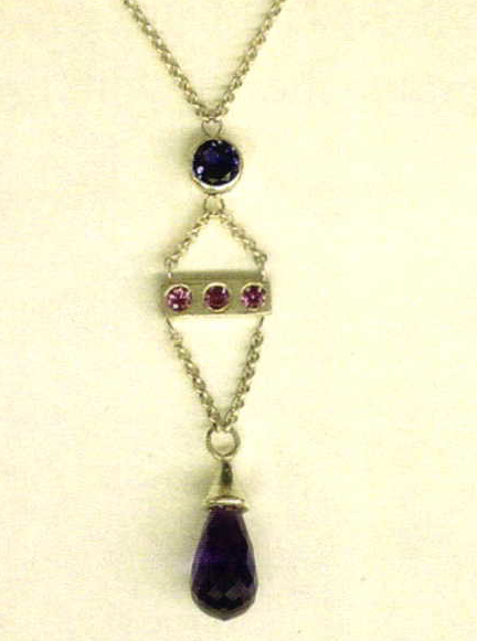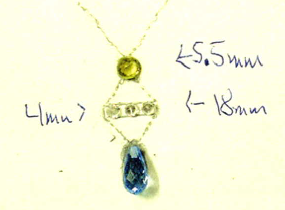 We spent about an hour trying different combinations of chain length till we were happy with the final look of the piece. Then, back to my buddy's shop to zap the rings closed. About ten minutes later, I'm heading back to my shop for final cleaning and polishing and gluing in the briolette. The photo shows the final product, a piece we call "Bella".