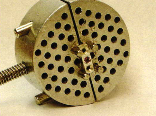Any jeweler that does custom work has to constantly figure out how to hold the piece you are working on to set the stones. I find that my small pin vise works just fine here, and the pins don't get in my way. The photo shows the center stone set, with two more to go.