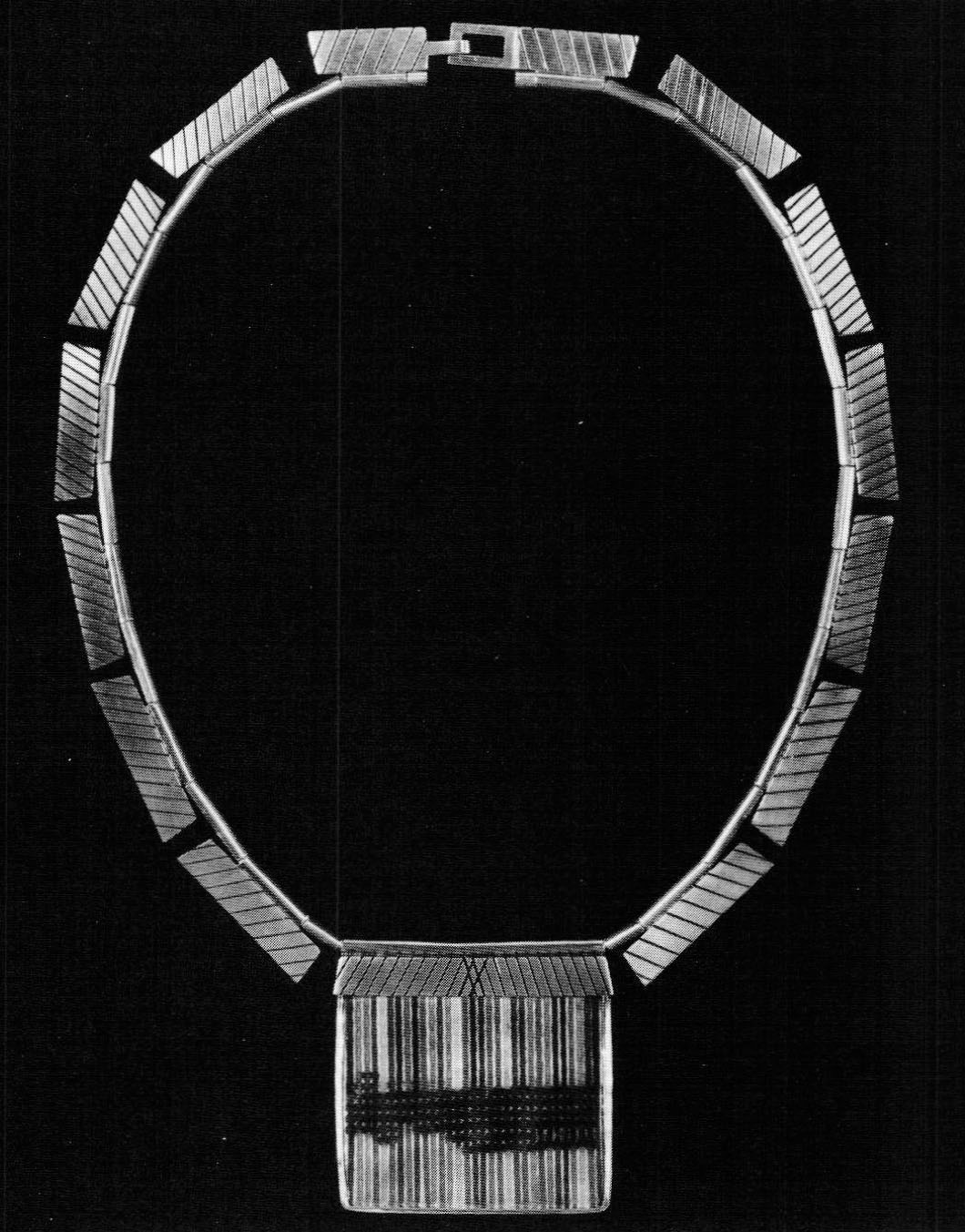 A cursory glance caught the consistency of expression in the collected works on exhibit, but a closer study revealed subtle changes in mood and elements of style. The metalwork in the first case clearly suggested elements of oriental architecture which enhanced and were enhanced in turn by the enamel color sequences. The second case in contrast had the feeling of integrating Eastern and Western influences, pieces reminiscent of the oriental architecture but modified by Western style of steel structures. The contrast of horizontal and vertical grid patterns and the juxtaposition of positive and negative forms created more dynamic content. The third case had pieces that evoked images of subtly rippling water, with color being dilineated over space. Others suggested the subtleties of strata definition in rock formations common to the Western landscape. The wall case was dominated by bar and lapel pins that gave the feeling of segments translated from woven tapestries strongly ethnic in character.