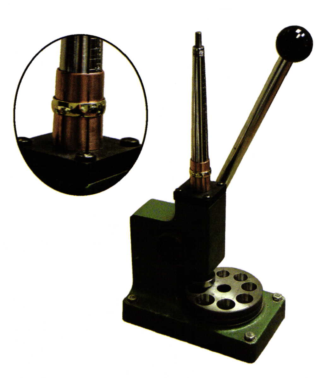 To stretch a wedding band that is larger than your ring stretcher mandrel, slip a copper sleeve over the mandrel and place the ring over the sleeve. The mandrel will press out on the copper sleeve, which in turn will press out on the wedding band stretching it to a larger size.