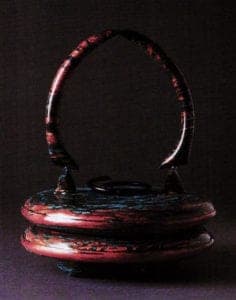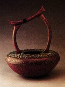Over the years Hull has accumulated elemental features that can be read nearly as well as a tree can be read through an examination of its annual growth rings. An early favorite is a handle, an arching, near-semicircle of three narrow lengths of tubing visually held together at one point by a modest, simple wrap of wire. This decorative element placed off center echoed Hull's interest in Japanese packaging design. Its purpose - that of bundling - represented the theme of gathering harvest crops. This wrapping element has remained in her work, although the styles of handles and other treatments change frequently.