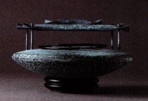 In this elegant early vessel we can see narrative content. The broad, wide container sits gently on a black double coil base - like a perfect river pebble set on a stand. The handle is extreme, even heavy, and it runs low over the broad shoulders of the pot. It also obstructs the mouth. The tubing of the handle is stacked, two lengths on the bottom with one short piece resting on top.