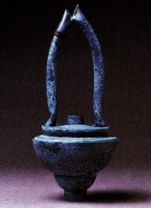 The story of this vessel is summed up by its nonpublic title, Burial Piece. It was Hull's intention to suggest the environment of the Plains Indians with a broad low profile, flat and exposed to the elements. The handle construction is an allusion to the practice of the Plains Indians who buried their dead above ground. There is a quiet, a calm and a reverence to this sculpture that fit this sentiment.