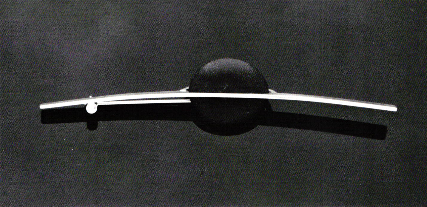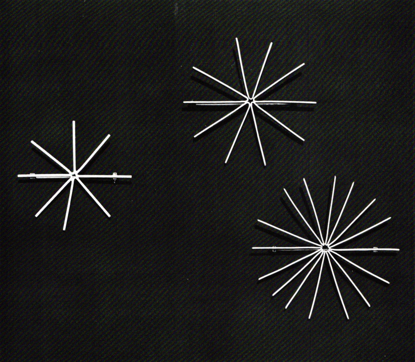 Betty Cooke's jewelry is reminiscent of the Large, gestural brushstrokes seen in both her watercolors and her persistent doodles. Although rejecting the amoeboid shapes used by Arp and Miro, she still creates "action" pieces based upon the curve. Although she occasionally explores the straight line, as well, that line is always straining to bend—never is it precisely angular. Maybe the "warmth" of her pieces comes from her use of this gestural shape. Her modus operandi involves choosing a curvilinear form from one of her myriad sketches and allowing it to develop into other shapes. She then refines the design, often modeling the prototype in paper until it is perfectly evolved, the goal being a subtle gracefulness.