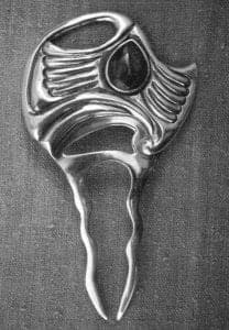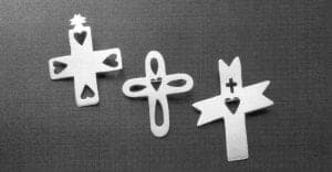 Of course, technical training alone does not make an artist - it merely enlarges her possibilities. In producing her first independent pieces for Contemporary Spanish Market, Rodriguez-Caraveo turned to vernacular "folk" art of the upper Rio Grande. Although the tradition boasts little jewelry, it is nonetheless rich in iconography. For Spanish Market, she followed the lead of her brother, Marry Rodriguez, a maker of wooden replicas of Camposanto crosses, a type of grave marker still found in village churchyard cemeteries in the Sangre de Cristo mountains. But Bernadette produced hers in silver, fabricating rather than casting. The experience was discouraging, in part because many potential buyers didn't understand how the work differed from mass production pieces of similar themes.