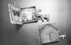 "Grandpa had some friends in Chimayó who always had farm animals - pigs or donkeys. The milagros drew that back from the past into my memory. The very first relicario I did was a man and a woman in a little box locket", she recalls. "The front is a farmhouse. You open it up and they're inside. On the side I put fencing and I had animals inside the fencing and on top of the fence."