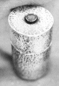 The head of the jewelry program, Ralph Lewis, spurred Rodriguez-Caraveo to pursue jewelry as a creative medium. A look at her student work shows why. Although her design skills had not reached full expression, her instincts were leading in an unconventional direction. And she was already shaping pieces more as a sculptor than a silversmith. Two pieces using the same hammering technique show her evolution. Her hammered silver earrings with blue lace agates of 1978 already demonstrated what would become a trademark tension between glassy and textured surface. Their complex shapes - the apparent free-form design is belied by the symmetry of the two pieces - is atypical of her work, perhaps more characteristic of student style at the time. By the time she produced the 1981 cylindrical silver box with an opal set into its lid, she had mastered the hammer to produce an effect that calls less attention to itself but clearly marks the piece as an artifact of a human hand. An inarticulate history of manufacture is proclaimed in each speck of recessed oxidization.