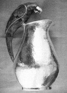 Yet a piece like Rodriguez-Caraveo's silver pitcher with bird handle for Los Castillos shows her own predilection for texture and narrative and a taste for the colloquial which derive from a long folk tradition. (Ceramic and stone vessels with bird handles dating from the first three centuries A.D. have been found at Teotihuacán, the pyramid city near modern Mexico City. Because Teotihuacán was the chief trade center of the Americas in its day, the vessels could have originated anywhere in Mesoamerica.)