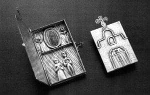 Most recently, Rodriguez-Caraveo has begun a series of one-of-a-kind pieces evolved from the relicario, a repository box for a sacred object. In Hispanic Catholic tradition, the relicario often takes the form of a locket with a saint's image. Rodriguez-Caraveo's particular pieces merge the form of devotional object with personal imagery to evoke the power of public archetypes in otherwise intimate statements.