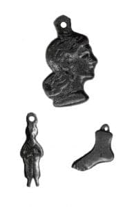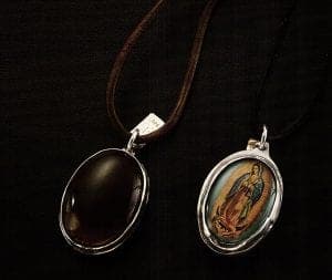 Using milagros as an element in jewelry was not a new concept. Mexican folk artists had been covering wooden crosses with them for many years, and Acapulco jeweler Pal Kepenyes designed an entire line of brass and bronze jewelry incorporating dozens to hundreds of milagros in each piece in the late 1970s and early 1980s. In both cases, the milagros are design elements that achieve their effect through accumulation and agglomeration. Rodriguez-Caraveo, on the other hand, isolates and juxtaposes individual pieces, which demand a more contemplative response.