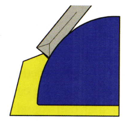 Using my half-round/round shaped bur, with the same overall equal dimensions or nearly the same contour as the cab, starting at the base of the bezel wall, scrape the surface at equal increments. At each 1/4 turn dig into the gold a tad deeper. I will have at my disposal many sizes of these modified burs. I will gauge each bur against the correct angle of the stone. This bur should not be used at a high rate of motor speed. Check often using your 10x power loupe at how you are progressing. Place the cab into this bezel recess.