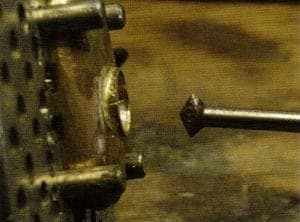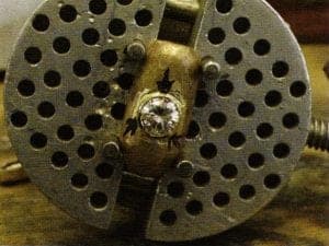 Next I'll use my prong pusher (or a hammer handpiece) and move the metal a little more. Since I'm trying to move the metal down evenly, I keep the piece rotating and apply a little pressure; then rotate the piece and do it again. It's now, while you're rotating the piece, that your marks come in handy because you always know where you are in relation to the weaker areas of the bezel. After I've worked my way around the bezel one or two times, I'll run my #40 graver around the inside again and clean it up. Over the course of setting this particular stone, I noted that I stopped and used my graver 7 times. The metal never had a chance to get too deformed, so once it was firmly against the diamond, it was perfectly clean, round, and flashing free.