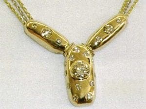 I remember that I struggled with the stone back then because it had a thick girdle and a fat pavilion. Looking at it 13 years later. I was actually surprised at how good it looked. All I remember was how much trouble it was, and I was never really happy with it…. but it was part of a wedding the next day and I had to let it go. (Oh, by the way, the chain broke which is why it was back in my shop…the stone did not fall out!) It's funny how when you're working on a piece, all you notice is what's wrong, not what's right. If you put it down and look at it a week later, all you notice is what's right and don't even notice anything wrong. As I was looking at this pendant. I realized that I set bezels much better now and that I use a few different techniques that I didn't know in 1993.