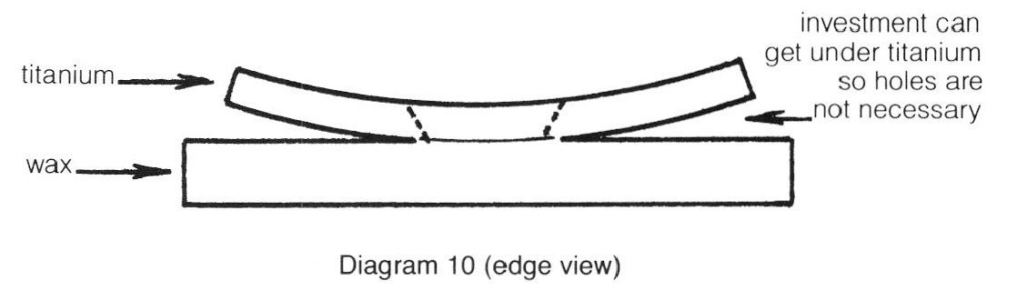 Another way of locking is to drill holes in the titanium and carve one side of the hole larger. These holes should be a minimum of 1/16" in diameter. When using thick titanium, it is not necessary to drill entirely through the metal, just a minimum of 1/16" deep. In all cases, the more undercutting and the wider and deeper the holes, the better, because cast metal is not strong and much stress takes place during heating and cooling. Wax should be placed in all of the holes so the incoming metal will form the rivets.