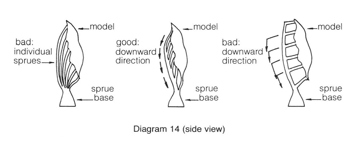 - In order to reduce turbulence and delay in filling, the cavity trunk and branches should run as close to parallel as possible and be oriented perpendicular to the sprue base as in the center drawing. Sharp bends and sprues lying parallel to the sprue base (right drawing) interfere with efficient metal flow.
