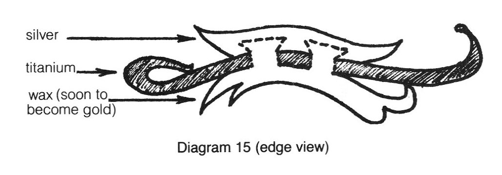 - In Diagram 15, the pre-formed gold and titanium part are joined by the wax, which eventually is replaced by silver. This requires one casting step, except for a possible previous casting step used to make the separate gold piece. If the gold piece is fabricated from wire or sheet, the no previous casting cycle is needed.
