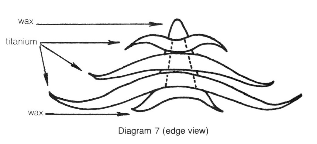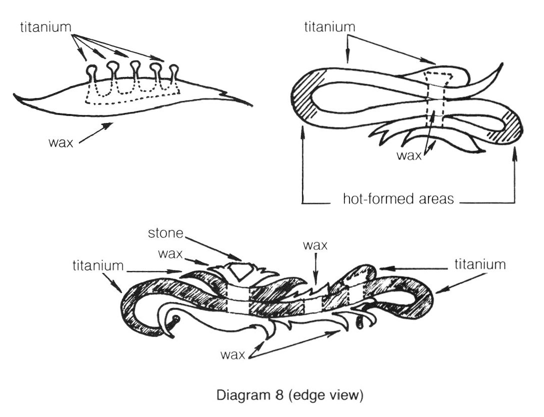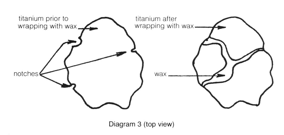 It is necessary to decide which interlocking method(s) will be utilized prior to any carving, forming or cutting of the titanium in order to leave sufficient excess metal. The sequence is very simple. First, you must plan on how the titanium will be locked in place when it is surrounded by incoming metal. Second, you must make sure the titanium is locked in place by the investment so it will not shift when the wax is drained during burn-out.