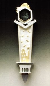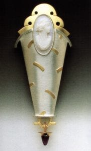Bill Ruth and Susan Mahlstedt, however, evince a more recuperative attitude toward the past and its patinated forms. These collaborators lift a beautifully carved cameo from its original setting and give it new life, not in a postmodern pastiche, but in a contemporary revival, like a careful and sensitive, but practical, remodeling of an old house. Their forms may recall military medals, the tinned wings of a Junior Birdman, or the awards we might have received for winning a spelling bee, back when it was thought essential to spell correctly. These tokens are not reconstructions of objects from some earlier time; they are new constructions of the present that have the power to elicit feelings that we may have thought lost or corrupted by the commodification of nostalgia.