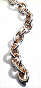 Theophilus Presbyter provided us with the first technical details of chain production as early as the 10th century. In his three volume work, the "schedula diversarum artium", he describes winding wire on a spindle and also how to make the chain round. He wrote "take a small board of oak or beech wood and make lots of holes in it with a pointed, round iron that is glowing. Now pull the chain that was glowed in the fire and then cooled down again through these holes… and carry on until the chain is approximately evenly thick and round." The Norwegian jewelry designer Tone Vigeland used the quotation "every chain is only as strong as its weakest link", Any goldsmiths still dedicated to the high art of hand making chains, for example the traditional company Mössner from Eisingen, can pay testimony to this. The gold and platinum chains by this firm, which are marketed under the jewelry brand IsabelleFa, are still manufactured step for step by hand, from putting together the alloy to the final polish. In this, the mixture of the ingredients is the first stage on the road to success: gold, silver and copper not only determine the color, but also the hardness of the material that will be processed. Once the alloy has melted and has been poured at 1,100 °C, a precious metal wire is drawn and then wound around a spindle in laborious hand work. The circumference of this spindle will determine the subsequent size of the loops in the chain. The winding is then released with a saw thus meaning that the loops can then be suspended individually in each other and then bent and soldered. This is where the true craftsmanship is seen: It is important to work extremely precisely on the joint in order to ensure that the solder points cannot be seen in the finished jewelry. A long process of minute work now starts with sanding, filing and multiple polishing of the individual loops from the inside and the outside. The crowning glory of the whole procedure is the clasp solution, which is manufactured with the typical production characteristics to suit each chain.