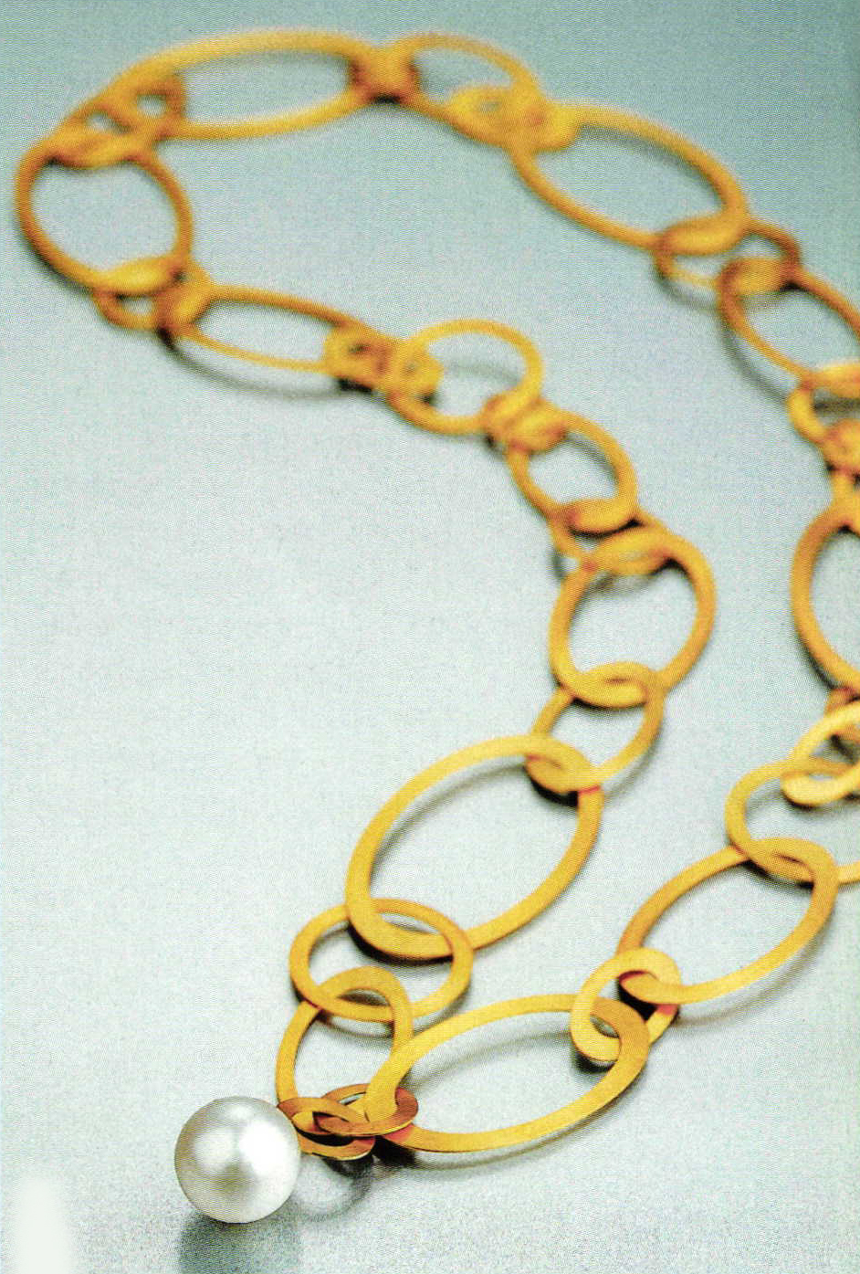 In addition to the high quality of the material and the precise processing, haptic impressions are also decisive criteria in the selection of a chain. A well worked piece not only has carefully soldered links, but is also extremely flexible and light. Chains are more comfortable to wear if they rest flush against the skin. Another exciting factor is that many chains are extremely light and therefore comfortable to wear, in spite of their voluminous appearance. Many designers have their own personal "signatures". For the Mannheim-based jewelry designer Dorothee Striffler for instance, who makes innovative chains as a large part of her creative work, the relationship between the chains, the space they are in and the person wearing them is always a decisive criterion. "The individual elements that make up a chain always describe and elucidate the space in which they are located. This means that they create interesting inner and intermediate spaces that are crafted consciously and should be appreciated with the same awareness," says Dorothee Striffler.