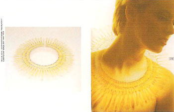 Seeing Bakker's work in person is often surprising because of its size, and the book's outsized photographs reflect this scale. It is impossible to appreciate the flower neckpieces without seeing them on the model. Take Chrysanthemum Necklace (1983) for example. On the page it is a pure, transparent circlet of three tiers of individual chrysanthemum petals in graduated sizes from neck to torso. Floating above the page it creates a suggestion of a shadow and attention is drawn to each pale golden leaf. The facing page shows the piece on the bare neck and shoulders of a young, blonde model. The lighting casts a golden glow on the entire page and now each petal casts a magnified and elongated shadow on her skin, while behind her head, the back of the necklace rises, transparent, into the air. On the body it gains an erotic dimension not apparent without the model, showing its relationship to the witty, sexy necklace Johnny Awakes, where laminated photographs of penises of graduated sizes stand in for pearls.