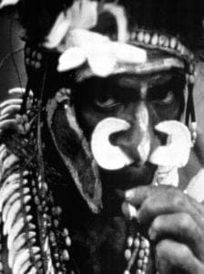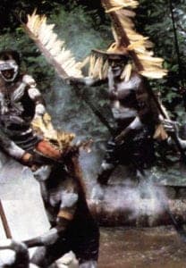 This afternoon was a political rally. Parading in circles on a big field were running, dancing, jumping, and chanting Dani and Lani warriors, bedecked with elaborate war headdresses of cus-cus fur and dramatic feathers of such birds as the cassowary, the white egret, and the colorful parrot. They wear necklaces of boar's tusks, fiber, seeds, and cowry, snail, and baler shells, which look like large white spoons; armbands of woven fibers; kotekas tied around their waists and under their scrotums. Their bodies are painted with mixtures of soot and pig fat, or colored clays.