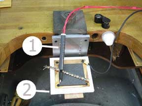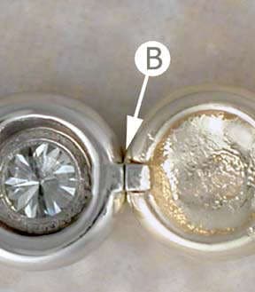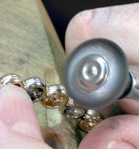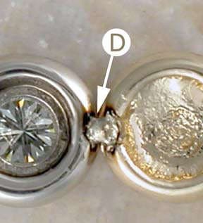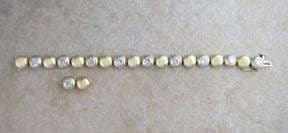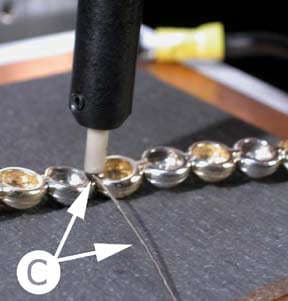 This Charles and Colvard created moissanite (hereafter referred to as moissanite) and two-tone karat gold in-line bracelet requires shortening by two links. The bracelet is held together by a heavy link-wire that's wrapped around an open portion of the adjacent link and permanently joined, giving the bracelet maximum flexibility. Below is a procedure for shortening, reassembling and permanent welding of the link using pulse-arc-welding technology..