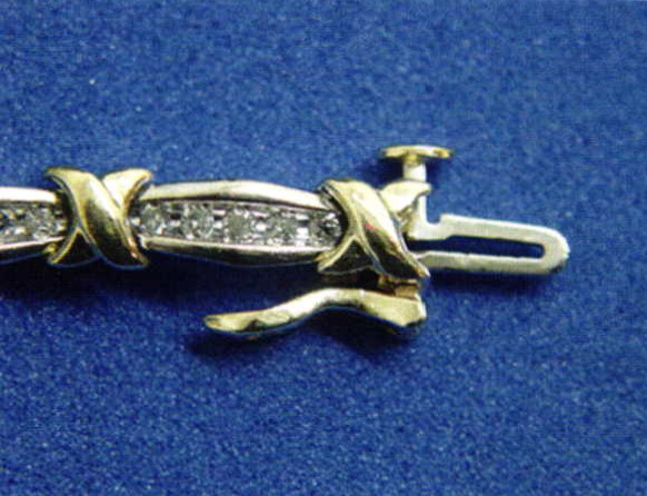 The first problem is alignment. Generally alignment is done by the trial and error method. The tongue is held in place in what is believed to be the proper alignment and soldered. Once cooled it is tested in the clasp. Often the alignment is off slightly and the two ends of the bracelet do not meet exactly either side to side or up and down, or the tongue depth is off slightly. If it is out too far when it snaps into the box there is a slight gap between the two ends, or if it is in too far the ends meet before the tongue locks into place. This all requires going back to the soldering bench, reheating the solder and making the necessary adjustments. This is not seen as a great problem, but it does take time for the jeweler to perform, and depending on the skill level of the jeweler may need to be done more than once. This extra time spent working on this eats into the shops profit, and often the repair is made with a good but not perfect fit.