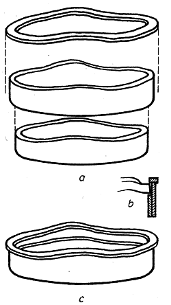 | Figure 12.2 Constructing a conical setting from a parallel wall frame. a) scoring, b) cutting, c) forging |