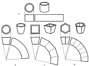 A parallel-walled frame is bent as before, by scoring the corners and folding up the form (figure 12.2b). This is then set on an anvil or similar steel form and planished at one end, making sure to strike each of the four surfaces equally. This will stretch the metal outward, forcing it into a pyramid shape.