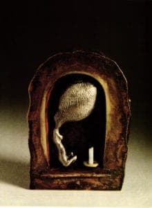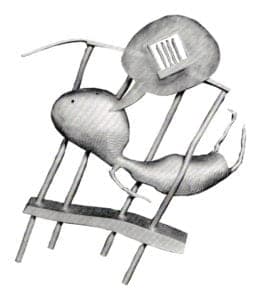 For example, in his brooch Crushed, there is a grimacing figure with a distended neck, leguminous head, ovoid eyes, truncated torso and atrophied limbs pressed between two pieces of black pumice. These elements are set against a softly textured, gray-and-orange field drawn on mylar. The gray zone of the drawing, with its repetitive spongelike pattern, subtly echos the porous surface of the volcanic rock. The figure is being crushed between the viselike grip of the rocks, reflecting one of Metcalf's major concerns over the years - emotional pain and alienation. Niche with Figure incorporates a figure that wraps itself up in its own desolation and in Mr. J. Speaks the figure is imprisoned in bars. Even Mr. J's symbolic utterance streaming from his mouth in a cartoon balloon contains the image of a cage reinforcing the nightmarish world of psychic entrapment.