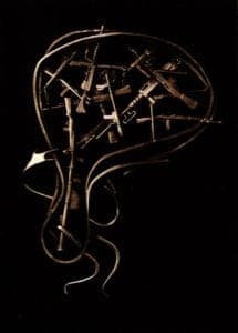 Headful of Bad Ideas consists of an inflated head framed by forged-wire balloons with soldered AK-47s and semiautomatic rifles. Headlock depicts a female figure with her head tightly wrapped with a band and secured by a lock. The references to pain are incisively illustrated as the interior world of infinite migraines. Surrounding this figure is a constellation of keys and entangling wires. These "dream keys" seem to offer a way to unlock and break the oppressive band of some uncontrollable force. But, ironically, there appears to be no way out of this psychic impasse.