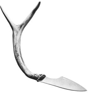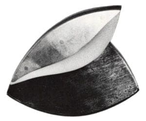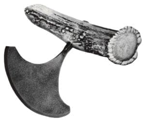 The traditional Eskimo ulu, used for chopping as well as eating food, inspired the blade of Food Chopper I. This blade shape is nearly universal, having been found in almost every early culture, perhaps in imitation of even earlier stonecutters. Whereas the ulu has a shorter neck, with the handle parallel to the blade, Clark's handle is at a 90 degree angle to the blade, and the neck is elegantly slender. The antler handle is highly polished to resemble ivory. In contrast to the ulu's textured blade, the edge of Clark's Chopper is clearly delineated by its extreme polish.