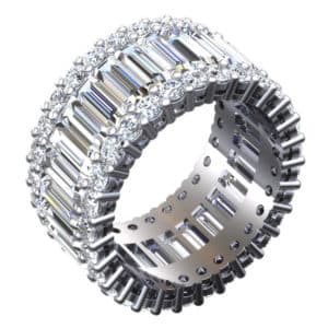 The job in question was a platinum eternity band featuring 32 baguette-cut diamonds encircled by two rings of round brilliant diamonds—a total of 58 2 mm stones. (Dickinson notes that the stone setting alone required 20 hours of work.) Between the need for exacting detail and the repetitive nature of the many stone settings in play, it was a design that could only sensibly be created using CAD.