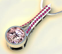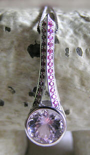 The pendant shown here as a rendering and a finished piece is a conceptual design of the Eiffel Tower featuring a well-cut kunzite as its centerpiece. Gemvision's Matrix software was a natural tool for Jen with her experience in graphic design.