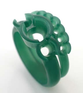 The waxes were milled using the Gemvision Revo 540 multiple axis mill. The total amount of time required for milling the two rings was less than 6 hours. The red arrow on the left indicates the wax that is being milled and the red arrow on the right points to the computer monitor showing the tool path that the cutter is following.