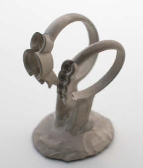 This photo features the two waxes after they were milled and prepared for casting. Here they are being checked for fit and alignment. Note: The bearings for the gemstones are included in the wax.