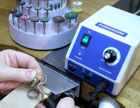 The waxes are sprued for casting using the Foredom Wax Carver wax pen with the small scoop tip. In this photo, the sprue wax is attached to the heaviest portion of the ring. The rings with sprues attached are weighed then attached to the sprue base. The Foredom wax pen has a small variable heat control that quickly heats the tip. The wax pen is connected to the control unit with an easily maneuverable lightweight cord making it ideal for the spruing process.