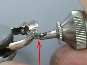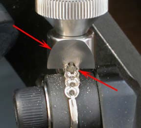 To prepare the bearings for the 2.5mm diamonds, the Foredom No. 52 quick release handpiece was used and the No. 52 AllSet Adapter kit. The arrow on the left points to the guide that rests on the top of the partial bezel wall. The arrow on the right shows the 2.4mm setting bur used to create each bearing. By using the AllSet, the bearings were evenly, systematically and efficiently created.